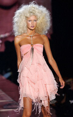 1月11日,2004/2005年意大利米蘭秋冬時(shí)裝展開場(chǎng),本次時(shí)裝展將在本月15日結(jié)束。圖為模特展示設(shè)計(jì)師Roberto Cavalli的作品。