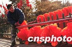 將于一月二十一日隆重開幕的北京第19屆地壇春節(jié)文化廟會,十三日正在緊張地籌辦之中,園林工人在廟會大門通道扎制紅彤彤彩燈牌坊、樹掛,準備迎接數(shù)八方游客。中新社記者:鄒憲