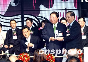 “香港時裝節(jié)秋冬系列2004及香港國際時尚薈萃2004”,1月13日至16日在會展中心舉行,圖為香港民政事務局局長何志平[中]、貿(mào)發(fā)局成衣業(yè)咨詢委員會主席鄭維志及貿(mào)發(fā)局總裁施祖祥[右]主持展覽開幕典禮。