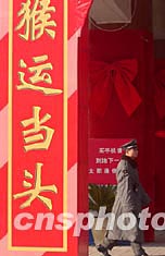 中國傳統(tǒng)農(nóng)歷猴年來臨之際,一家大型商場打出“猴運當(dāng)頭”(諧音“鴻運當(dāng)頭”)的賀歲標語。隨著春節(jié)臨近,北京街頭大紅燈籠和賀歲標語比比皆是。中新社記者:張煒