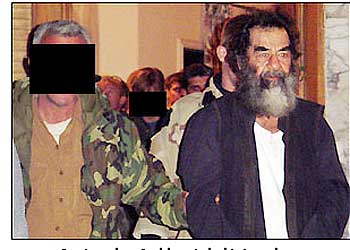 在被從骯臟的地下藏身地拖出來之后,他就被帶到了附近底格里特壯麗的大理石皇宮中。當(dāng)他被帶進(jìn)從前富麗堂皇的皇宮司令部的一個(gè)房間時(shí),看到房間里擠滿了喜悅的美國(guó)部隊(duì),66歲的薩達(dá)姆看上去非常不知所措。