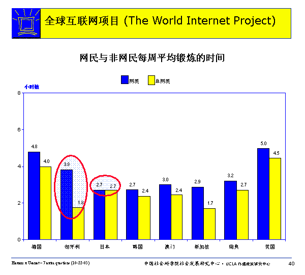網(wǎng)民平均每周的鍛煉時(shí)間多于非網(wǎng)民,日本除外。