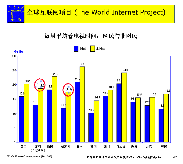 在WIP所有調(diào)查國(guó)家里,網(wǎng)民平均看電視時(shí)間少于非網(wǎng)民。網(wǎng)民和非網(wǎng)民看電視情況差異最大的國(guó)家是智利和匈牙利,兩國(guó)網(wǎng)民每周平均看電視時(shí)間比非網(wǎng)民少5.7個(gè)小時(shí),日本網(wǎng)民每周看電視時(shí)間比非網(wǎng)民少5.3個(gè)小時(shí),美國(guó)網(wǎng)民每周看電視時(shí)間比非網(wǎng)民少5.2個(gè)小時(shí)。