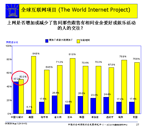然而,還是有相當(dāng)數(shù)量的網(wǎng)民認(rèn)為使用互聯(lián)網(wǎng)增加了他們同跟他們有相同業(yè)余愛好或相同娛樂活動的人的交往;這樣的網(wǎng)民在中國最多,47.2%被調(diào)查的中國互聯(lián)網(wǎng)網(wǎng)民認(rèn)為互聯(lián)網(wǎng)增加了增加或極大的增加了交往。