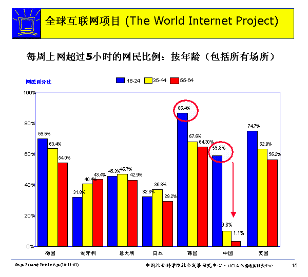 在德國、韓國、中國和美國,年輕網(wǎng)民比年齡大的網(wǎng)民更可能每周上網(wǎng)5小時以上。