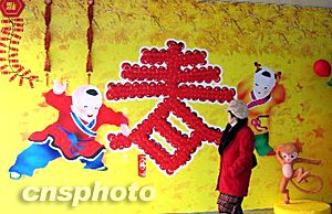 2004年1月14日,行人走過(guò)上海街頭一幅“喜娃報(bào)春”的年畫前。中國(guó)的傳統(tǒng)佳節(jié)——春節(jié)就要到來(lái),申城街頭隨處可見傳統(tǒng)的中國(guó)年畫。井韋 攝