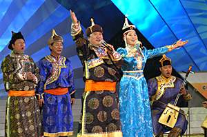 最為奇特的是來自內(nèi)蒙古大草原的男女兩組呼麥歌手,他們的呼麥唱法,起源于宗教,已有近兩千年歷史。一位歌手一張嘴,同時發(fā)出高、中、低三種聲音,分別表示對天、地、神的尊敬。這種獨特古老的演唱方式,曾盛行于蒙古大汗的宮庭,后來才逐漸傳入民間。