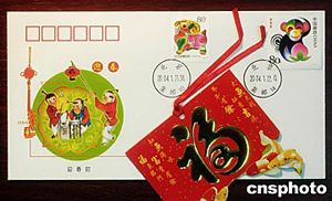 中國農歷甲申年到來之際,北京市郵票公司為向民眾致以新春佳節(jié)誠摯問候,和美好祝福,將于2004年1月22日發(fā)行《迎春封》一枚。該迎春封即貼有癸未年(羊年)郵票,又貼有甲申年(猴年)的郵票,并在癸未年郵票上加蓋2004年1月21日(農歷癸未年十二月三十日)24點的北京郵政日戳;在甲申年郵票上加蓋2004年1月22日(農歷甲申年正月初一日)0點的北京郵政日戳,以表達辭舊歲、迎新春的吉祥之意。中新社記者:鄒憲