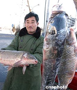 圖:京郊春節(jié)市場銷售者推銷巨型鮮活魚