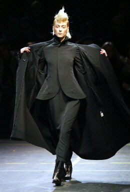 1月18日在法國巴黎,模特演繹了在服裝界中素有藝術(shù)家美稱的日本服裝設(shè)計(jì)師——山本耀司設(shè)計(jì)的2004春夏時(shí)尚女裝。