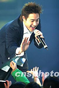 一月十八日晚,中央電視臺(tái)《音樂現(xiàn)場(chǎng)》春節(jié)特別節(jié)目“紅歌匯2003之?dāng)y手同行、治安之歌——慰問首都公安干警演唱會(huì)”在北京舉行,著名歌手潘瑋柏受到歌迷的熱烈歡迎。中新社記者:盛佳鵬