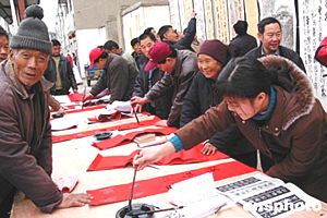 河南許昌尚集鎮(zhèn)書(shū)畫(huà)村的農(nóng)民書(shū)法家們?yōu)榇迕窳x寫(xiě)春聯(lián)。尚集鎮(zhèn)民風(fēng)古樸,文化氛圍濃厚,一直保留著習(xí)書(shū)的傳統(tǒng)。作者:慎重