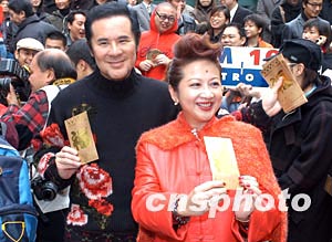 香港新城電臺1月27日舉行甲申猴年新春團(tuán)拜,新城電臺行政總裁甘國亮與《家天下》主持薛家燕在新春團(tuán)拜活動上大派利是。作者:鄧慶樂