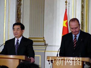 今天是中法建交四十周年紀(jì)念日,正在法國(guó)進(jìn)行國(guó)事訪問(wèn)的中國(guó)國(guó)家主席胡錦濤和希拉克在巴黎進(jìn)行了正式會(huì)談,會(huì)談后雙方簽署了“中法聯(lián)合聲明”。該聲明強(qiáng)調(diào),中法兩國(guó)將深化全面戰(zhàn)略伙伴關(guān)系,致力于建立更加安全、更加尊重多樣性和更加團(tuán)結(jié)的世界。