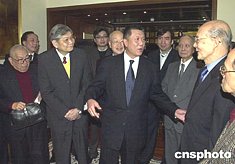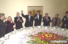 澳門特區(qū)政府二十九日在禮賓府舉行午宴,宴請(qǐng)澳門各新聞媒體,圖為行政長官何厚鏵向出席午宴的嘉賓拜年。