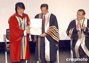 理工大學(xué)校長潘宗光說,很高興向成龍頒授名譽(yù)教授,以表揚(yáng)他在全球電影業(yè)的杰出成就。他又說,成龍?jiān)陔娪笆聵I(yè)上建樹良多,他還在全球積極推廣中華文化和香港旅游業(yè),成績斐然。