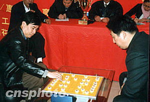 二月五日元宵佳節(jié),柳大華(右)、呂欽(左)兩位中國象棋特級國際大師在廣東惠州市為當(dāng)?shù)氐南笃鍚酆谜哌M(jìn)行了精彩表演賽。作者:宋秀杰