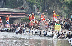 富有濃郁客家風(fēng)情的羅坊“走古事”,2月5日在“客家祖地”閩西連城縣羅坊鄉(xiāng)舉行,第四屆中國(guó)冠豸山客家民俗文化節(jié)由此拉開帷幕。羅坊“走古事”系由幾隊(duì)人馬各抬一架“古事”(上有一古裝打扮孩童),在陸上、水中爭(zhēng)先前行的民俗活動(dòng)。作者:黃翔