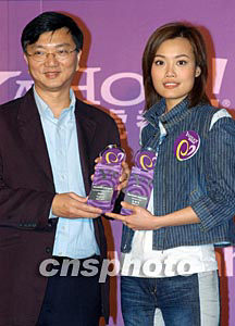 歌星容祖兒2月5日在香港出席《Yahoo!感情品牌大獎2003-2004》頒獎典禮,她分別為“日清食品”及化妝品牌“~H2O+”代言獲獎,雅虎香港總經理蔡寶德先生頒發(fā)兩個“感情品牌代言人”獎項予容祖兒。作者:鄧慶樂