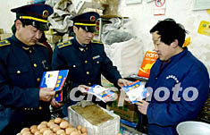 二月六日,北京東城工商分局工作人員為轄區(qū)十個集貿(mào)市場出售禽類產(chǎn)品的商戶送去新出版的預(yù)防“禽流感”的書籍。作者:羅偉