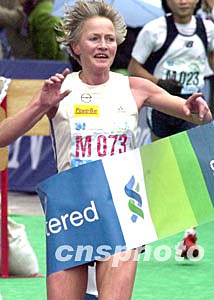 “渣打馬拉松2004”二月八日在香港舉行,來自丹麥的選手卡妤爾奪得該賽公開組女子冠軍。圖為卡妤爾在終點(diǎn)沖刺。 作者:錢興強(qiáng)