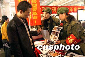 北京國(guó)際婚紗攝影暨婚慶用品禮品展覽會(huì)二月十二日在中國(guó)國(guó)際展覽中心舉行,北京一家婚紗攝影網(wǎng)的工作人員身穿綠軍服向觀眾介紹全新影樓數(shù)碼照片。