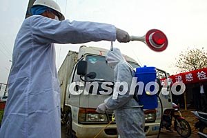 記者今天隨國務院新聞辦組織的中外記者團前往南寧興寧區(qū)疑似禽流感疫區(qū)采訪,汽車行駛十分鐘后,速度忽然減慢,記者看到,在進入興寧區(qū)的一個路口,六位身穿隔離服,背著噴霧器的工作人員正仔細地為進出的每一輛車進行消毒。