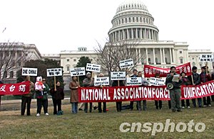 中新社華盛頓二月十二日電(記者余東暉)美國(guó)大華盛頓地區(qū)的華人和留學(xué)生十二日在國(guó)會(huì)山前集會(huì),并向一百六十多名國(guó)會(huì)眾參兩院議員遞交聯(lián)合簽名信,表達(dá)反對(duì)臺(tái)灣當(dāng)局搞“公投”和擔(dān)憂美中關(guān)系因此受到破壞的心聲。