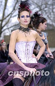 2004年2月,在英國(guó)倫敦秋冬時(shí)裝周上,著名時(shí)裝品牌Harriets Muse別出心裁,在倫敦街頭舉行服裝展示,引來許多路人關(guān)注。Ic/cnsphoto 攝