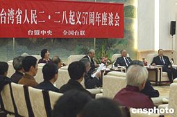 中新社北京二月十九日電(記者劉舒凌)臺(tái)灣民主自治同盟中央委員會(huì)、中華全國臺(tái)灣同胞聯(lián)誼會(huì)十九日在人民大會(huì)堂臺(tái)灣廳舉行座談會(huì),紀(jì)念臺(tái)灣省人民“二二八”起義五十七周年。