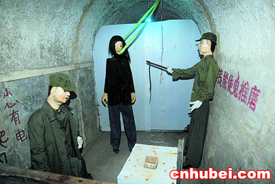 在一女性“烈士”受刑點前,導(dǎo)游向游客介紹,只要投入硬幣,美蔣特務(wù)就可揮動鞭子抽打烈士。這時,一名游客向投幣箱內(nèi)投入一元硬幣后,電動控制的“美蔣特務(wù)”果然揮鞭施刑,在“美蔣特務(wù)”背后的洞壁竟然寫著:“有錢能使鬼推磨”。