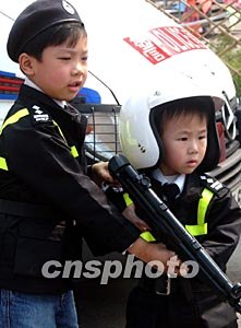 香港西區(qū)警區(qū)聯(lián)同中西區(qū)滅罪行委員會(huì),二月二十二日舉行滅罪跑嘉年華活動(dòng),該活動(dòng)的目的是透過(guò)有益的活動(dòng)宣傳滅罪訊息并推廣健康生活,圖為兩位小朋友對(duì)展示的警務(wù)器械頗感興趣。中新社記者:錢(qián)興強(qiáng)