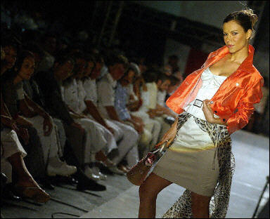 面對著6組射程在38公里的“飛魚”導(dǎo)彈的發(fā)射裝置,在2門100毫米口徑的自動炮的下面,一條長達(dá)40米的白色塑料毯上,模特們展示著各名家的服裝作品。