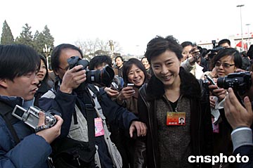 三月三日,全國(guó)政協(xié)十屆二次會(huì)議在北京召開(kāi),全國(guó)政協(xié)委員楊瀾成為記者追逐采訪的對(duì)象。中新社記者:張勤