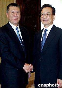 中國國務(wù)院總理溫家寶在北京會見來京列席十屆全國人大二次會議的澳門特別行政區(qū)行政長官何厚鏵。中新社記者:鄭萍萍