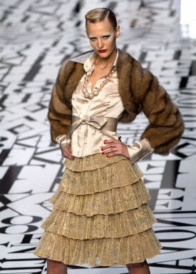 在巴黎2004/2005秋冬時(shí)裝周上,模特展示設(shè)計(jì)師新款時(shí)尚秋冬女裝。