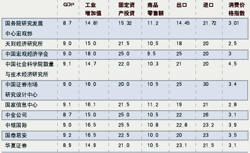 2003年中國(guó)全年GDP增長(zhǎng)9.1%,達(dá)到1997年以來(lái)GDP的最高增速。目前經(jīng)濟(jì)學(xué)界較為一致的看法是,中長(zhǎng)期中國(guó)經(jīng)濟(jì)仍可保持強(qiáng)勁的增長(zhǎng)勢(shì)頭,但對(duì)于GDP能否保持去年的增速或者超過去年的增速卻有很大分歧。一種觀點(diǎn)認(rèn)為,2003年經(jīng)濟(jì)增長(zhǎng)達(dá)到短周期波動(dòng)的波峰,2004年將進(jìn)入短周期波動(dòng)的收縮期,經(jīng)濟(jì)增長(zhǎng)速度將出現(xiàn)小幅度下降。另一種觀點(diǎn)認(rèn)為,中國(guó)經(jīng)濟(jì)可能突破傳統(tǒng)的周期,2004年GDP增速可能再創(chuàng)新高。而《證券市場(chǎng)周刊》特邀10家機(jī)構(gòu)所作的2004年一季度宏觀經(jīng)濟(jì)預(yù)測(cè)也體現(xiàn)了這兩種不同的觀點(diǎn)。