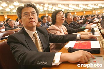 來自香港的全國政協(xié)委員馮華健在全國政協(xié)十屆二次會議的閉幕會上按表決器,表決各項(xiàng)決議。中新社記者:史利