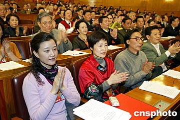 全國政協(xié)十屆二次會議三月十二日在北京人民大會堂閉幕,宋祖英(左一)、吳玉霞(左二)等委員鼓掌祝賀會議成功。中新社記者:毛建軍