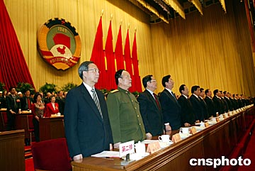 全國政協(xié)十屆二次會議十二日在北京人民大會堂閉幕,在主席臺就座的人員全體起立唱國歌。中新社記者:滿會喬