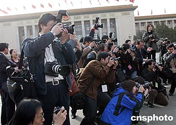 全國政協(xié)十屆二次會議十二日在北京人民大會堂閉幕,采訪大會的記者在會場外抓拍的陣勢頗為壯觀。中新社記者:滿會喬