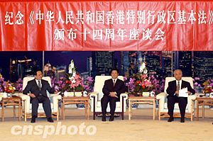 會上,中國社會科學(xué)院法學(xué)研究所所長、香港基本法委員會委員夏勇就“基本法的歷史意義和國際意義”,國務(wù)院港澳事務(wù)辦公室副主任、香港基本法委員會委員陳佐洱就“正確理解基本法規(guī)定的中央與特區(qū)關(guān)系”,港區(qū)全國人大代表王英偉就“基本法確定了行政主導(dǎo)型政治體制”,港區(qū)全國政協(xié)委員蔡冠深就“基本法與香港資本主義經(jīng)濟發(fā)展”,香港大學(xué)教授、香港基本法委員會委員陳弘毅就“基本法與香港的民主進程”,中央政府駐香港聯(lián)絡(luò)辦公室主任高祀仁就“貫徹落實‘一國兩制’,全面執(zhí)行基本法”等內(nèi)容先后發(fā)了言。