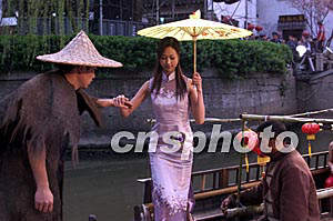 三月十四日,“古鎮(zhèn)西塘”2004年國際旅游小姐大賽中國區(qū)總決賽在西塘古鎮(zhèn)新搭建的水上舞臺進(jìn)行大賽前的整體排練,三十二位參賽佳麗逐個(gè)乘坐烏蓬船登上舞臺。中新社記者:盛佳鵬