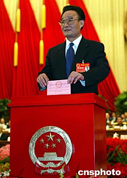 下午四時(shí)五十八分,在軍樂隊(duì)高奏國(guó)歌后,吳邦國(guó)委員長(zhǎng)宣布十屆全國(guó)人民代表大會(huì)二次會(huì)議閉幕。