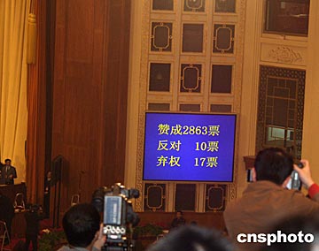 十屆全國(guó)人大二次會(huì)議下午舉行閉幕會(huì),與會(huì)代表以投票表決的方式通過憲法修正案。二千八百九十張有效票中,贊成二千八百六十三票、反對(duì)十票、棄權(quán)十七票,憲法修正案獲得通過。