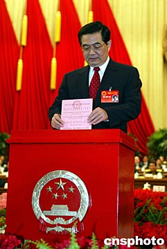 十屆全國人大二次會議三月十四日在北京人民大會堂舉行閉幕式,中共中央總書記、國家主席胡錦濤投票表決“憲法修正案草案”。中新社記者:毛建軍