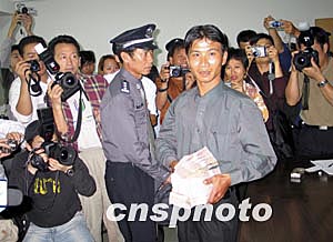 二十九歲的三亞市民陳賢壯因舉報有功,今天獲得公安部頒發(fā)獎金二十萬元,及三亞市委、市政府獎金五萬元。他在新聞發(fā)布會上表示能夠為打擊犯罪份子立功,感到很光榮。