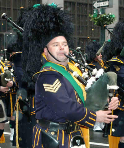 十七日,雖然嚴(yán)寒,卻沒有影響紐約愛爾蘭人慶祝節(jié)日的興致,愛爾蘭風(fēng)笛手仍舊穿著花格短裙沿著曼哈頓五大道緩緩行進(jìn)。引人注目的還有游行隊(duì)伍中身著迷彩服的美國(guó)戰(zhàn)士,這是往年并不多見的一只隊(duì)伍,美伊戰(zhàn)爭(zhēng)后,這只隊(duì)伍成為美國(guó)愛爾蘭裔人的驕傲。
