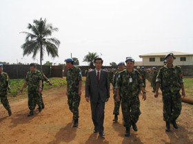 歡迎儀式結(jié)束后,林大使在周紹瑞參謀長(zhǎng)及中國(guó)維和部隊(duì)各分隊(duì)領(lǐng)導(dǎo)的陪同下,視察了我維和部隊(duì)營(yíng)地,并看望了各級(jí)指戰(zhàn)員。