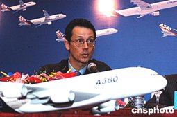 空中客車公司價(jià)格政策高級(jí)副總裁奧利維安德列斯,三月二十四日在北京介紹擁有555個(gè)座位的超大型飛機(jī)-A380飛機(jī),并對(duì)中國市場前景極為樂觀。首架A380飛機(jī)今年五月開始總裝,二零零六年計(jì)劃投入運(yùn)營。作者:王麗南